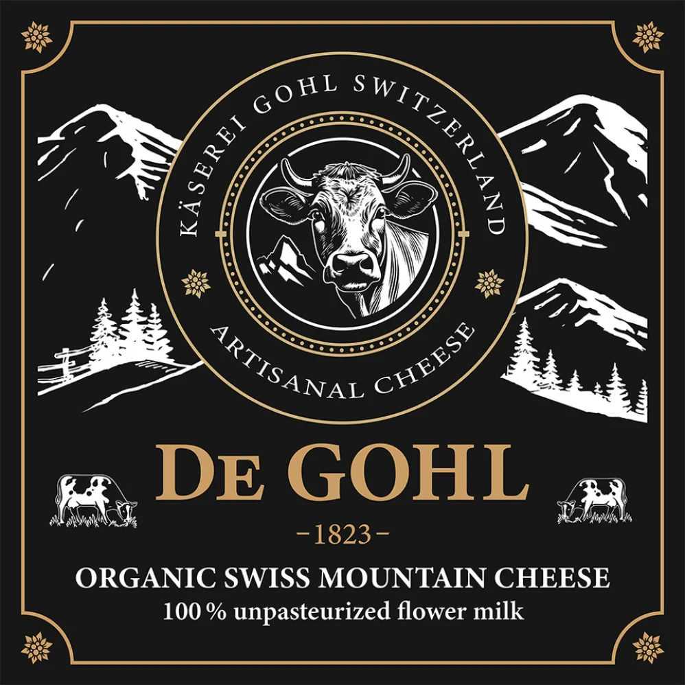 DE GOHL BLACK is a wonderfully creamy, large 30 kg hard cheese, very similar in shape, consistency and taste to the classic Gruyère. De Gohl cheese is traditionally made from fresh raw milk according to an old family recipe and is matured in the cheese cellar for at least 5 months. A typical Swiss raw milk semi-hard cheese of the highest quality that appeals to a wide audience, made only from grass and hay milk, salt and rennet, without any additives. The cheese is naturally lactose-free and a rich source of calcium.